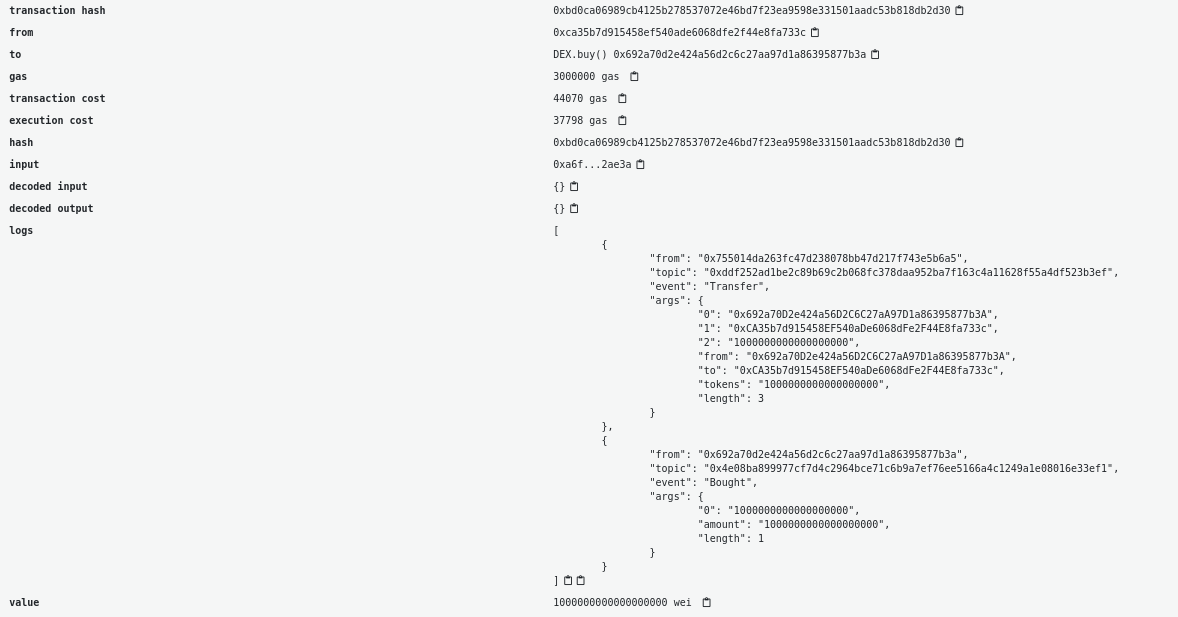 1function buy() payable public {2    uint256 amountTobuy = msg.value;3    uint256 dexBalance = token.balanceOf(address(this));4    require(amountTobuy > 0, "You need to send some ether");5    require(amountTobuy <= dexBalance, "Not enough tokens in the reserve");6    token.transfer(msg.sender, amountTobuy);7    emit Bought(amountTobuy);8}In the case where the buy is successful we should see two events in the transaction: The token Transfer and the Bought event.